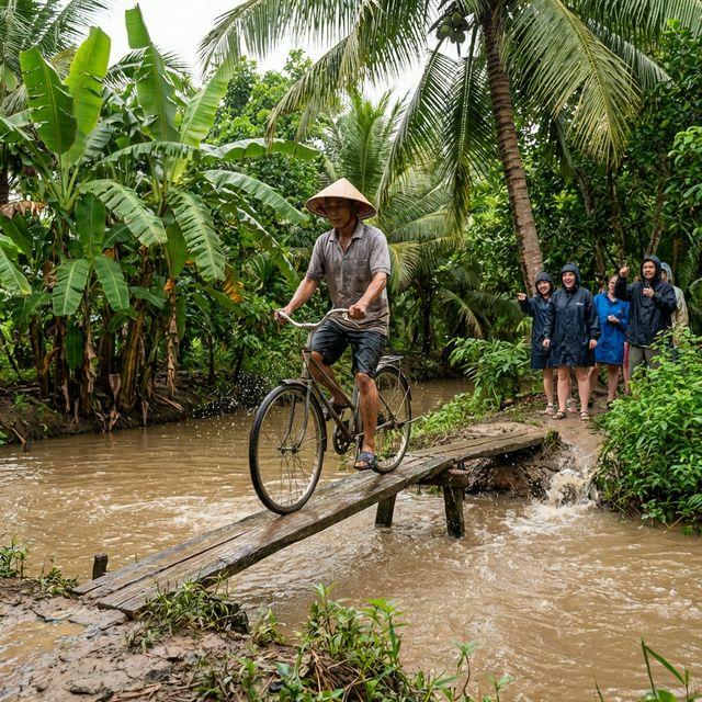 Thử thách lòng dũng cảm và sự khéo léo với màn đạp xe qua cây cầu gỗ siêu hẹp trên mặt nước.